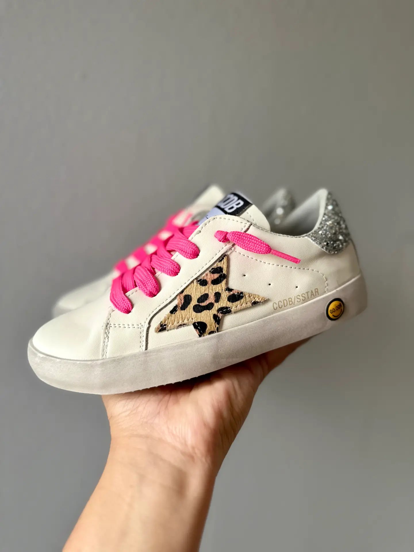 Step up your style game with our Cheetah Star Sneakers! These trendy kicks feature stylish pink laces and a unique Star design, while the soft and cushiony insole ensures long-lasting comfort. With slip-resistant soles, they're perfect for kids of all ages. Available in various closure options and sizes. Plus, we're going green by shipping without boxes!