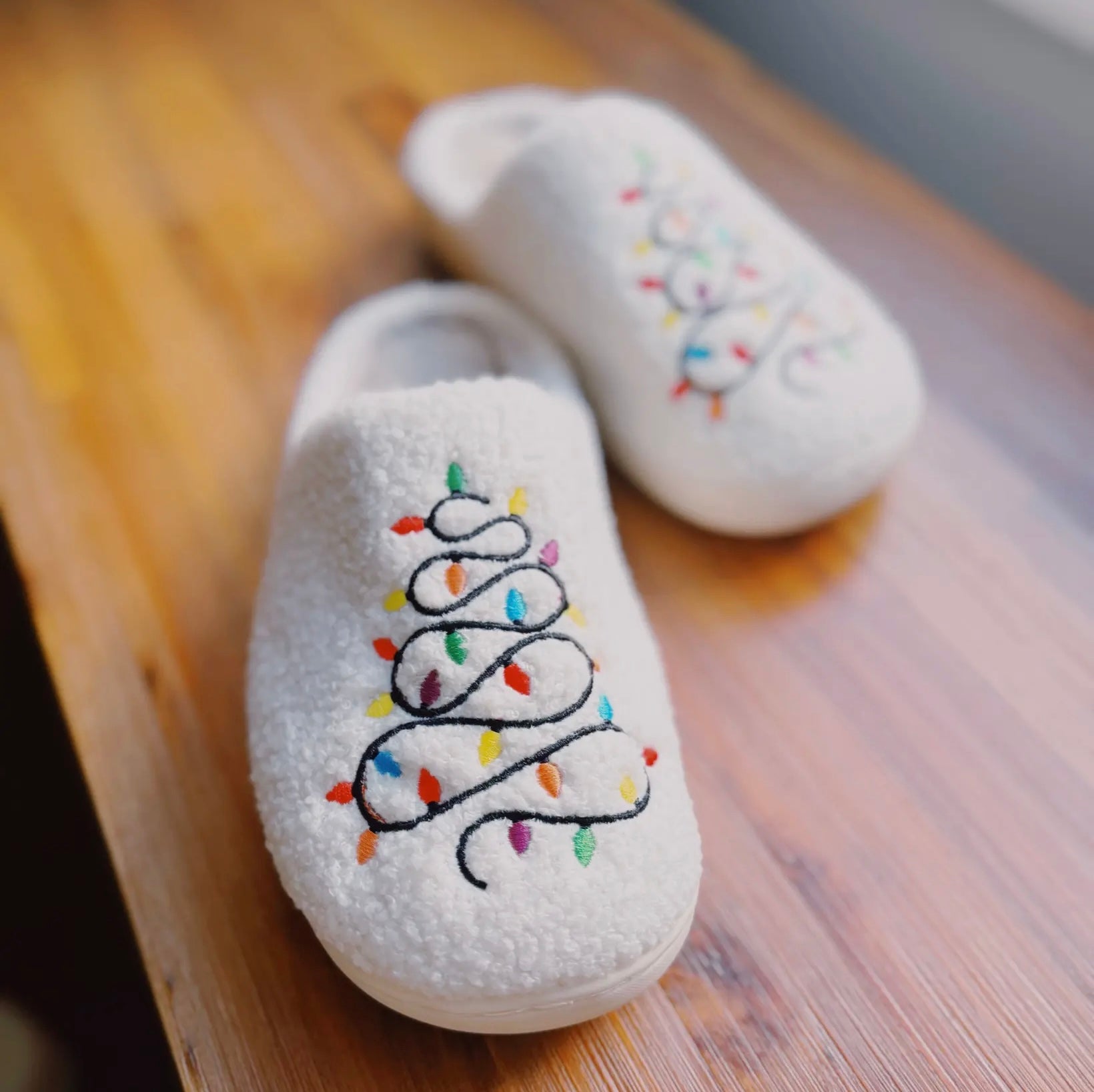 Add a festive touch to your holiday season with our Christmas Tree Slippers. These cozy slipper feature a charming Christmas tree design, complete with string lights for added cheer. Give the gift of warmth and comfort this holiday season.
