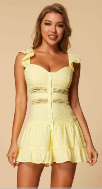 Solid V neck lace short romper with lace detail finishes, sleeveless with ruffled details. Zipper closure in the back.