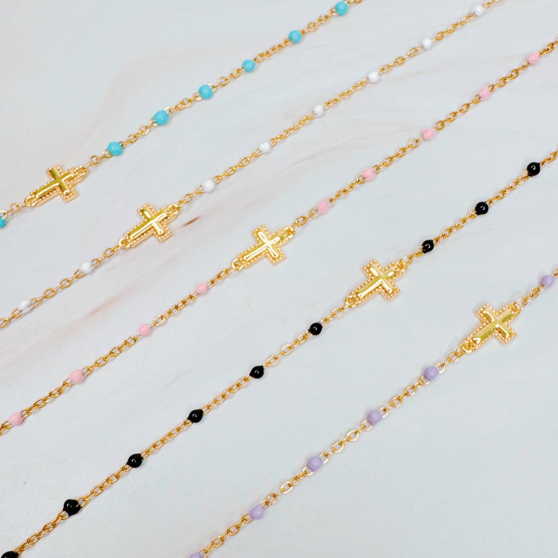 Add a touch of modern elegance to your wrist with this bracelet. The lovely coloring and stylish cross add a charming touch, while the dainty chain design gives a delicate and sophisticated look.