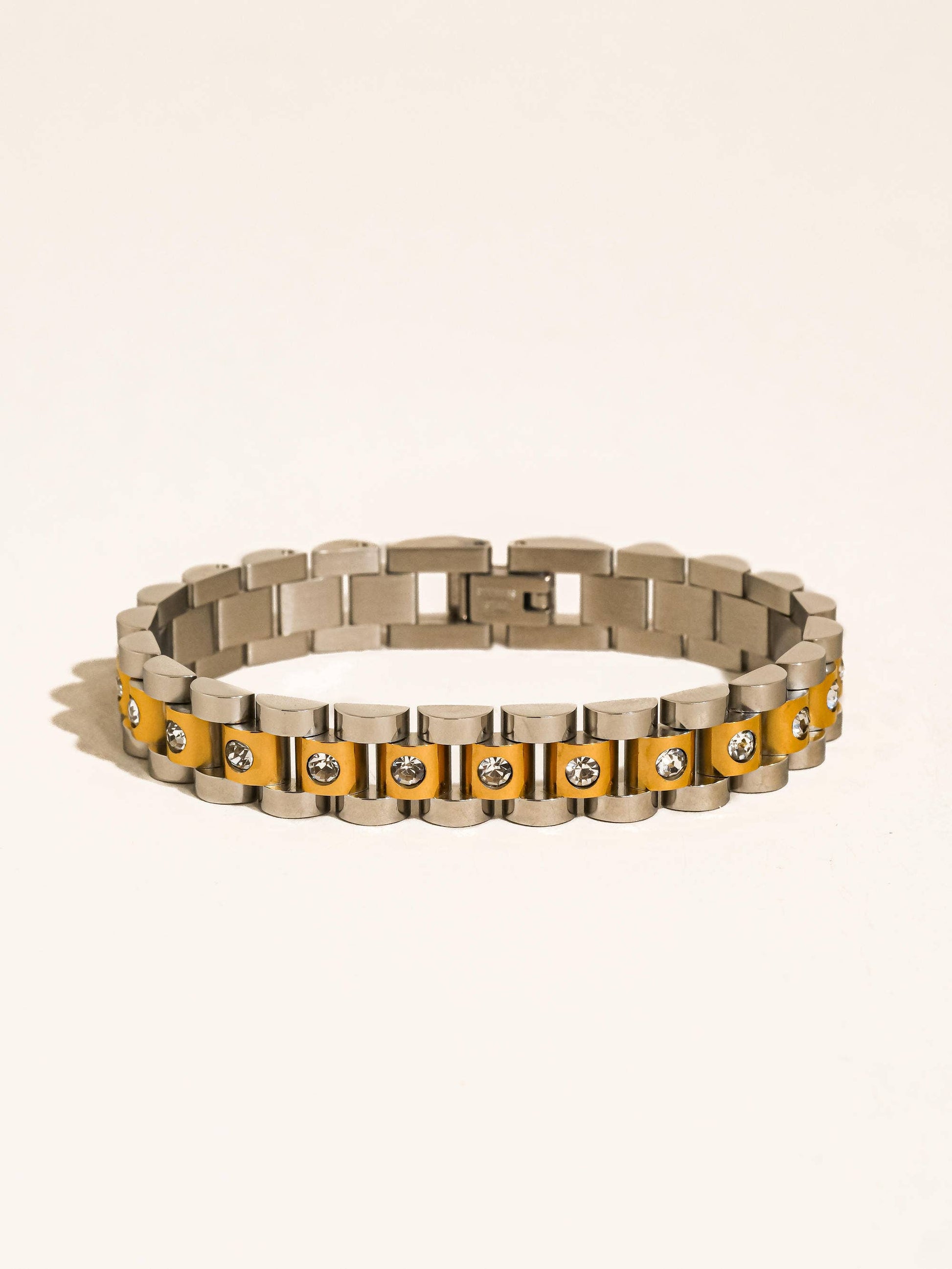 Sophisticated with a modern twist. This 18K gold-plated stainless steel bracelet features a two-tone watchband design accented with brilliant cubic zirconia for a refined yet striking finish. Crafted for lasting wear, it’s non-tarnish, water-resistant, and hypoallergenic, blending timeless style with everyday durability.