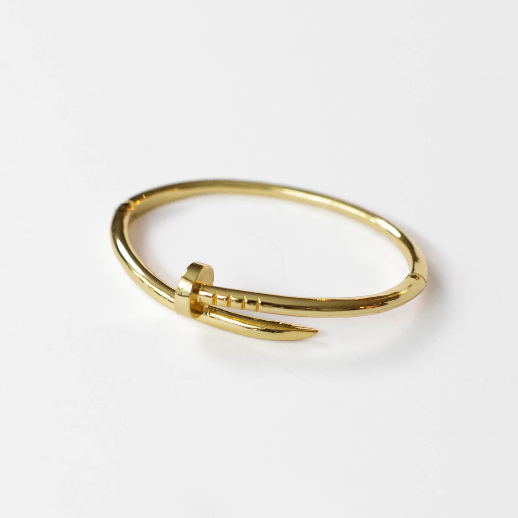 This gold nail cuff adds a unique and stylish touch to any outfit. Made with high-quality materials, it is durable and long-lasting. The sleek and modern design is perfect for those looking to make a statement. Elevate your accessory game with this must-have piece.