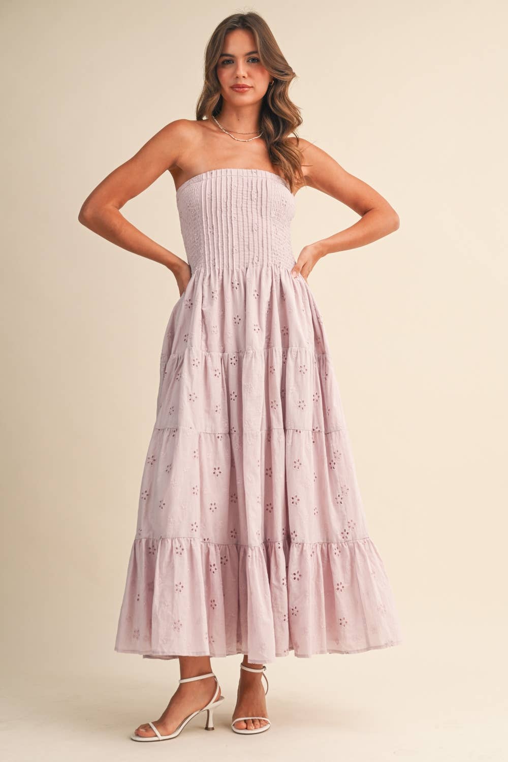 A dreamy strapless midi dress designed to turn heads. This piece features delicate eyelet fabric with soft pleating and layered tiered details that create beautiful movement with every step. Finished with a flattering midi length, it’s the perfect blend of romantic and effortless. Crafted with a breathable 100% cotton shell and fully lined in smooth polyester for comfortable all-day wear.