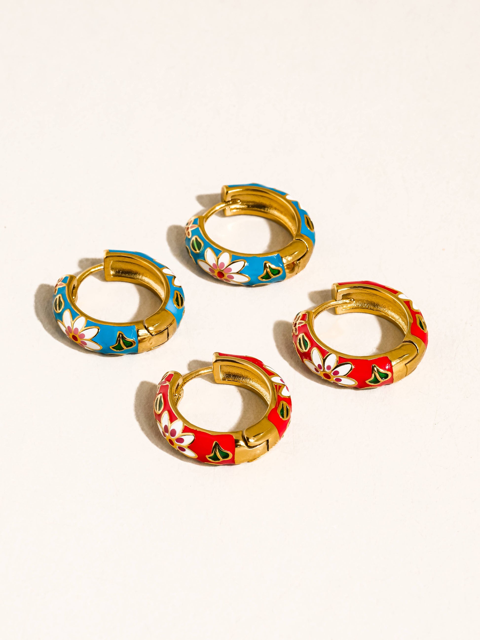 18K Gold Non-Tarnish Vintage Floral Hoop Earrings 18K Gold Plating Stainless Steel Oil Drip Measurement (L x W inch): 0.82 x 0.23 - Lead-free, Nickel-safe - Hypoallergenic - Water Resistant