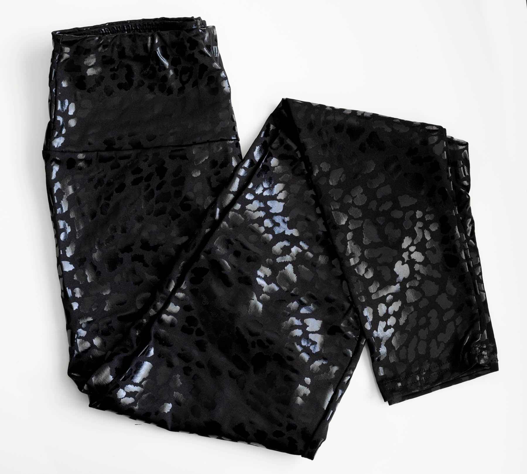 These Black leggings with Leopard Texture are fabulous! Sized in woman’s. Fits like a glove.