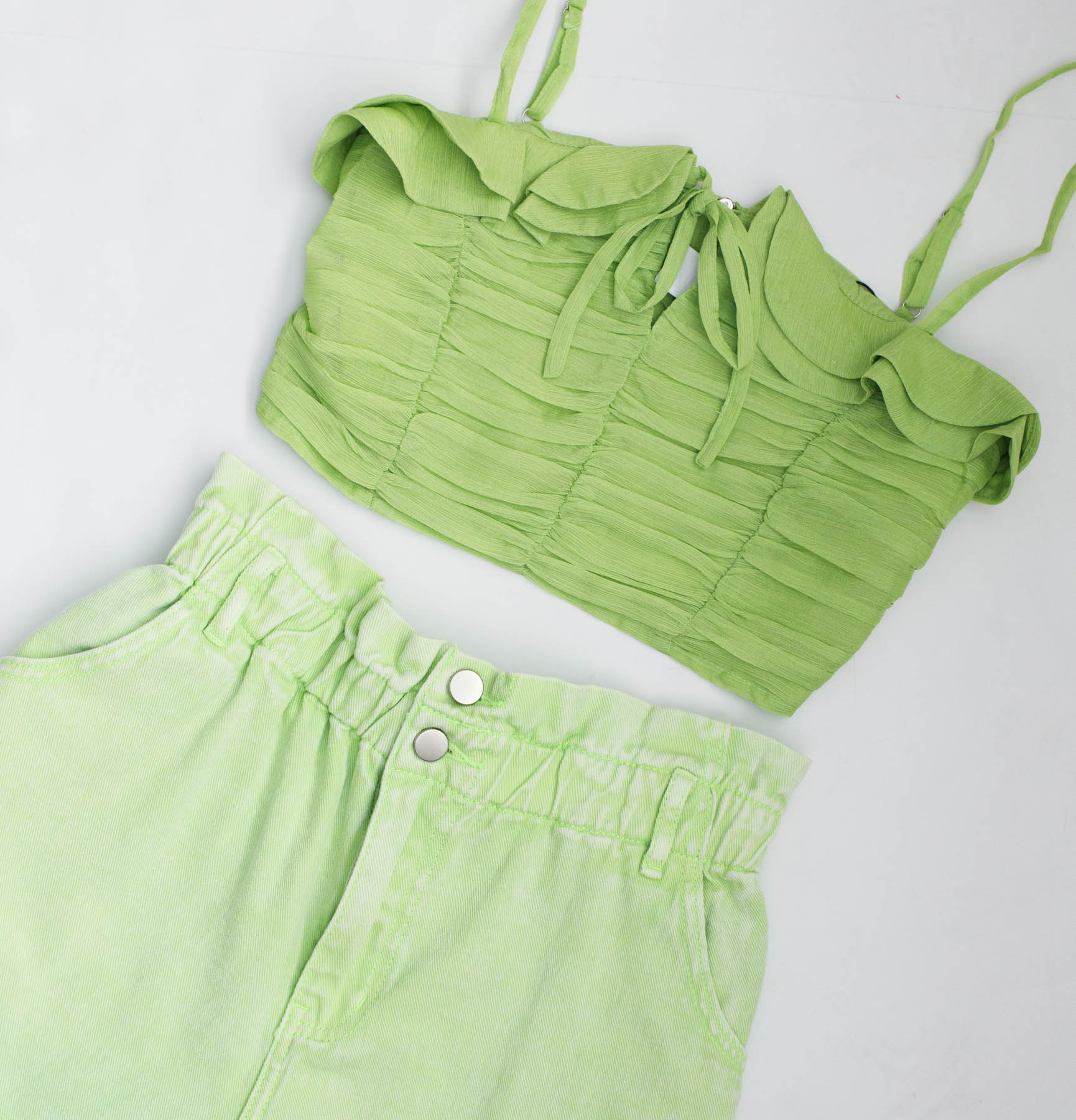 Look stunning in the Lurex Double Ruffle Ruched Crop Top, featuring a modern lurex fabric with double ruffle detailing, zipper back, and ruched accents. Match this stylish crop top with its matching skirt to complete your look. Perfect for special occasions and formal events.