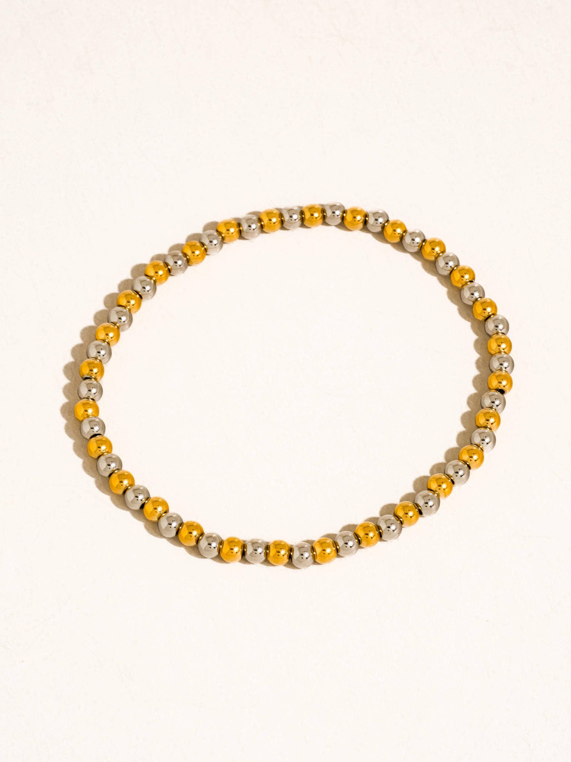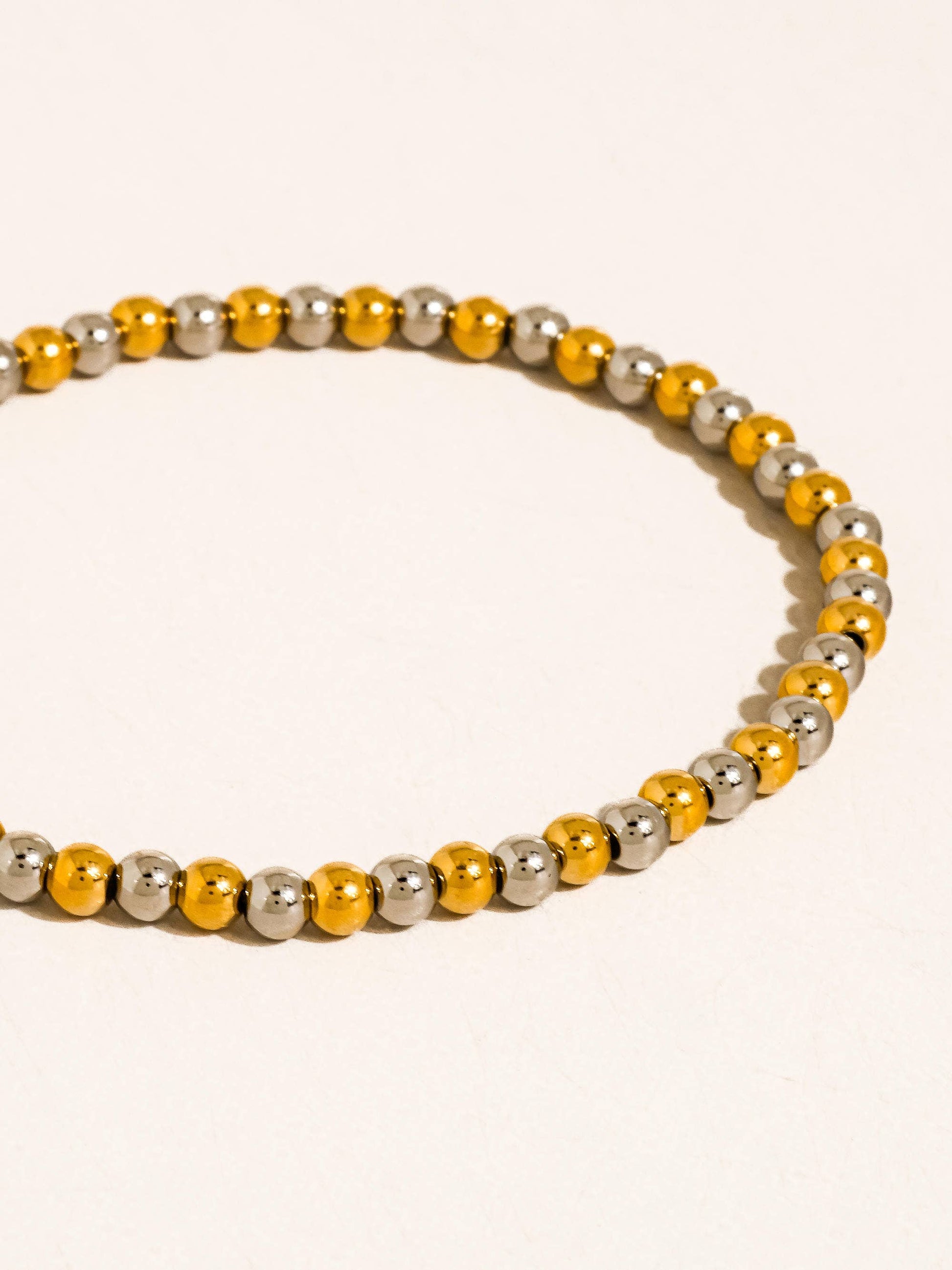 18K Gold Non-Tarnish Two Tone Beaded Stretch Bracelet (Sold Separately) 18K Gold Plating Stainless Steel MEDIUM BEADS Measurement (L x W inch): 7.48 x 0.23 SMALL BEADS Measurement (L x W inch): 7.48 x 0.15 - Lead-free, Nickel-safe - Hypoallergenic - Water Resistant