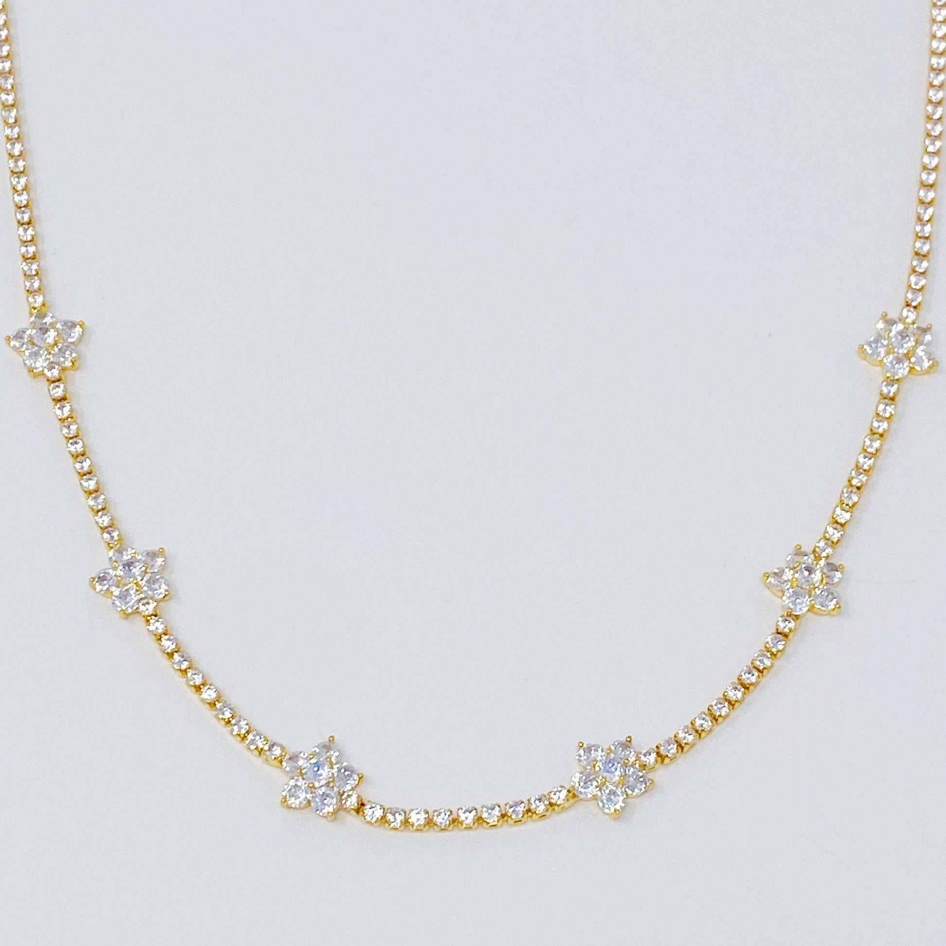 Beautiful shiny necklace with clear stone flowers. Can be worn as a choker or full necklace. Great for layering or wearing on by itself.