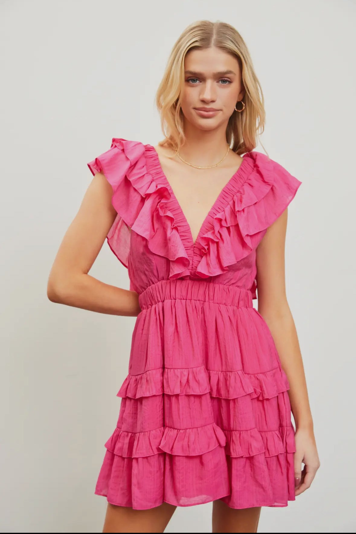 Be bold and beautiful in our Fuchsia Deep V Ruffle Dress! The stretch waist ensures a comfortable fit, while the deep V neckline and tiered skirt add a touch of femininity. Turn heads with the eye-catching color and ruffle detail. Perfect for any occasion. sized for woman.